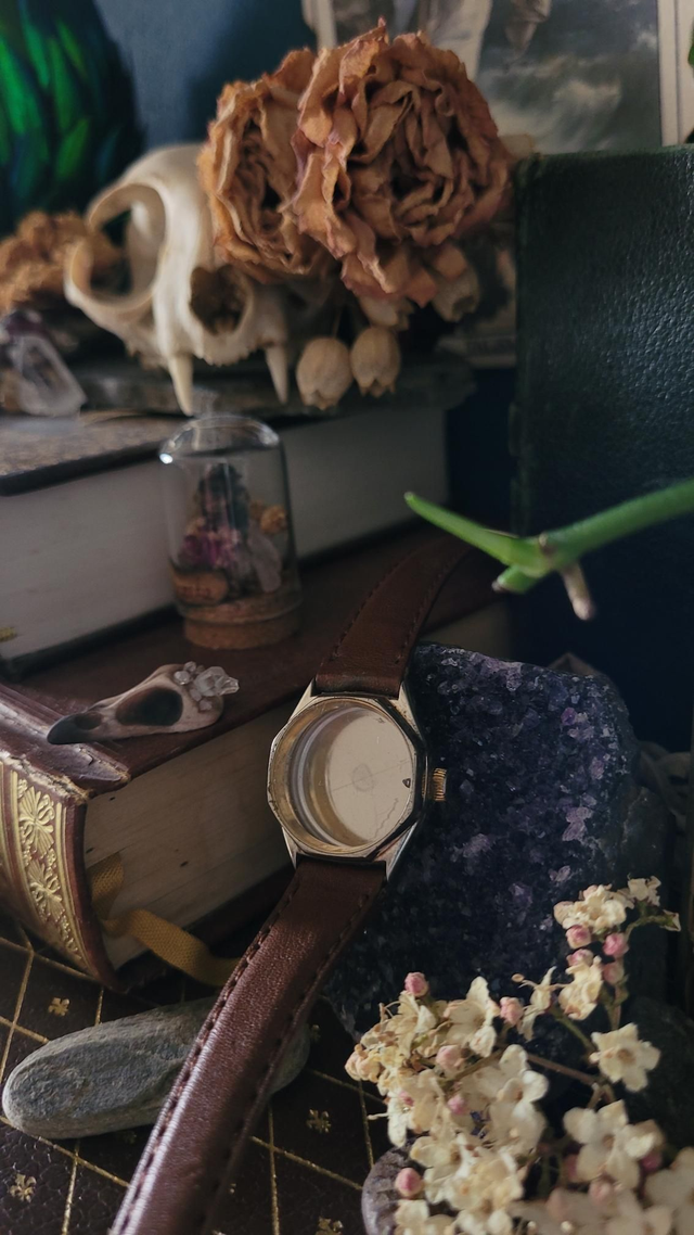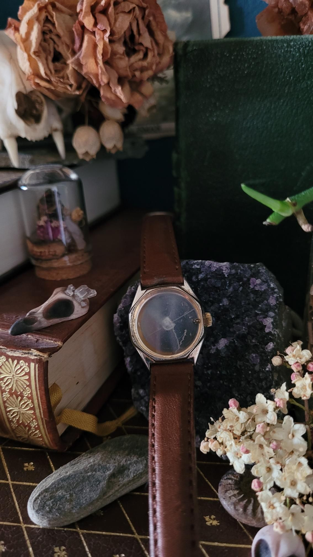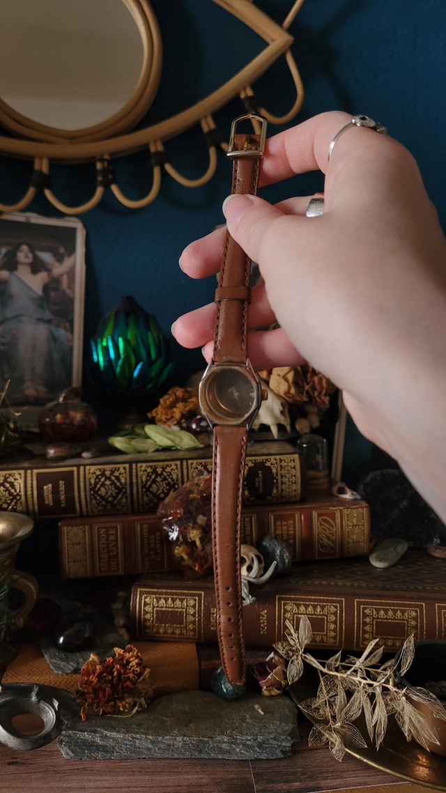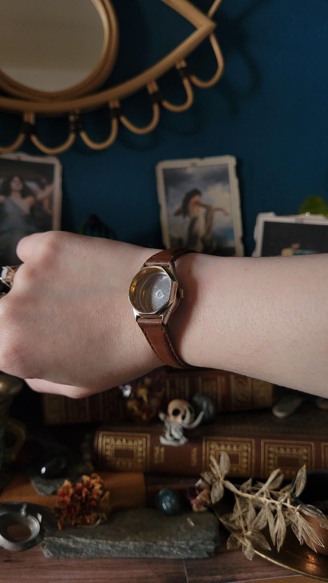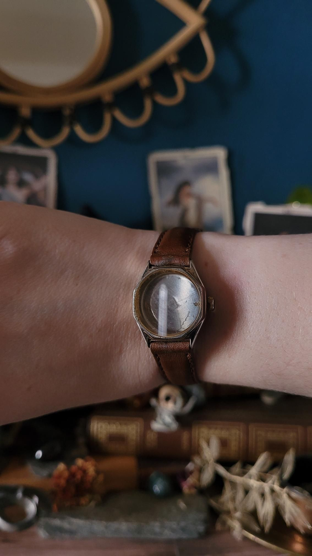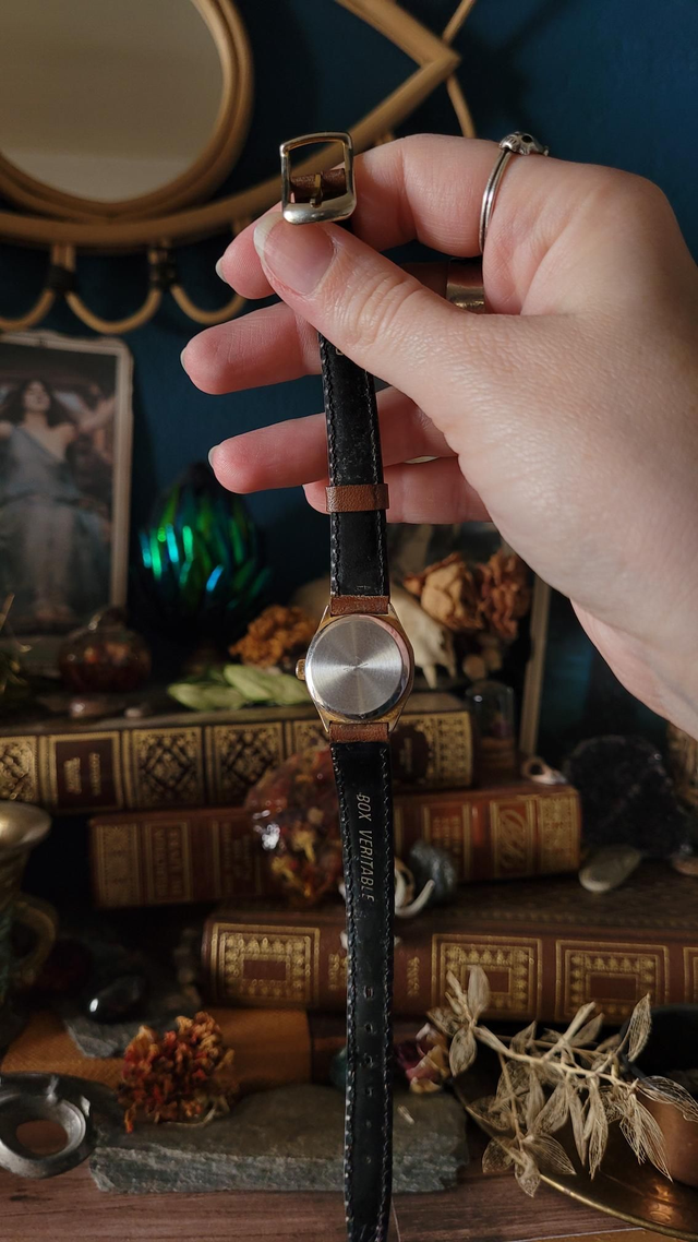 Montre bracelet en métal argenté (le plaquage doré est quasiment entièrement partie) et imitationcuir marron. Bon état, pas de rayure sur le verre, le bracelet a un peu vieilli mais reste en tres bon état. Taille du cadran, environ 2cm de diamètre.